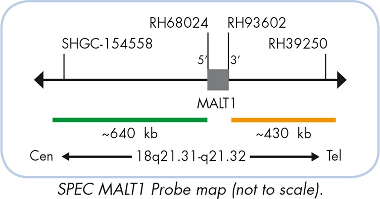 The ZytoLight ® SPEC MALT1 Dual Color Break Apart Probe is designed to detect translocations involving the chromosomal region 18q21.32 harboring the MALT1 gene. The MALT1 (mucosa associated lymphoid tissue lymphoma translocation gene 1, a.k.a. MLT) gene encodes a human paracaspase and is often rearranged in MALT lymphomas accounting for 5-10% of all B-cell non-Hodgkin lymphomas (NHL). The most common translocations affecting the MALT1 gene are t(11;18)(q22.2;q21.3) and t(14;18) (q32.3;q21.3) occurring in 50% and 15-20% of MALT lymphomas, respectively. These translocations lead to the expression of BIRC3-MALT1 (a.k.a. API2-MALT1) and IGH-MALT1 fusion proteins, resulting in constitutive activation of the NF-κB signaling pathway which controls the expression of numerous anti-apoptotic and proliferation-promoting genes. The translocation t(11;18)(q22.2;q21.3) is mainly found in pulmonary and gastric lymphomas, whereas t(14;18) (q32.3;q21.3) occurs more frequently in non-gastrointestinal MALT lymphomas, e.g., of the skin and salivary glands. The presence of a t(11;18)(q22.2;q21.3) correlates with unresponsiveness to eradication of Helicobacter pylori in gastric MALT lymphomas. Hence, detection of MALT1 translocations by Fluorescence in situ Hybridization (FISH) may be a supportive tool to identify patients eligible for anti H. pylori therapy.