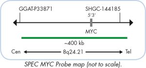 The ZytoLight ® SPEC MYC/CEN 8 Dual Color Probe is designed for the detection of MYC gene amplifications found in a variety of human tumors. The MYC proto-oncogene (v-myc avian myelocytomatosis viral oncogene homolog, a.k.a. CMYC) is located in the chromosomal region 8q24.21 and encodes a transcription factor that can activate and repress transcription thereby regulating expression of numerous target genes that are essential for cell growth and proliferation. Deregulation of MYC is a common denominator in cancer. MYC amplification was found e.g. in breast, colon, kidney, lung, ovary, bladder, head and neck, and endometrial cancer. Several studies showed a correlation between gene amplification and disease progression or recurrence in breast cancer and other malignancies. Malignant cutaneous angiosarcomas, for example, but not benign and atypical vascular lesions occurring after radiotherapy of breast cancer are characterized by amplification of the MYC gene. The presence of MYC amplification is thus of considerable diagnostic importance for the distinction of malignant from atypical postradiation vascular neoplasms of the skin. Since inactivation of MYC appears to be effective in the treatment of neoplasia MYC targeting therapies have been developed some of which have entered clinical trials.