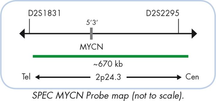 The ZytoLight ® SPEC MYCN/2q11 Dual Color Probe is designed for the detection of MYCN amplification which represents the most powerful unfavorable prognostic factor for neuroblastoma. Less frequently amplifications are found in retinoblastoma, small cell lung cancer, astrocytoma and other tumors derived from the neuroectoderm. The MYCN (v-myc avian myelocytomatosis viral related oncogene, neuroblastoma derived, a.k.a. NMYC) gene is located in the chromosomal region 2p24.3 and encodes a 62-64 kDa transcription factor mainly expressed in the developing nervous system. Amplification of the MYCN gene is found in about 25% of primary neuroblastomas and is strongly associated with rapid tumor progression, advanced stages of the disease, and poor prognosis. Hence, amplification status is increasingly being used for stratification of patients to different treatment protocols.