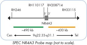 The ZytoLight ® SPEC NR4A3 Dual Color Break Apart Probe is designed to detect translocations involving the chromosomal region 9q22.33-q31.1 harboring the nuclear receptor subfamily 4, group A, member 3 (NR4A3; a.k.a. TEC, NOR1, CHN) gene.Extraskeletal myxoid chondrosarcoma (EMC) is a rare soft-tissue sarcoma of chondroblastic origin that occurs primarily in adults. The tumor is characterized by recurrent chromosomal translocations resulting in fusions of the NR4A3 gene to various N-terminal partners including EWSR1, RBP56, TCF12, and TFG. NR4A3 is a member of the steroid/ thyroid receptor superfamily and acts as a transcriptional activator. The resulting chimeric proteins contain N-terminal parts of the various partners fused to the entire coding sequence of NR4A3. The most frequent reciprocal translocation is t(9;22) (q22.3-q31;q12.2) found in about 70% of EMC generating a EWSR1-NR4A3 fusion gene in which the 3’-terminal part of EWSR1 is replaced by the entire NR4A3 gene. EMC is histologically characterized by a mixture of cellular and myxoid stromal components, making it difficult to distinguish it from other benign or malignant mesenchymal tumors. Since chromosomal translocations of EWSR1 are found in several different neoplasias while NR4A3 rearrangements have been exclusively detected in EMC, assessment of NR4A3 rearrangements by Fluorescence in situ Hybridization might represent a helpful tool for the differential diagnosis of EMC.