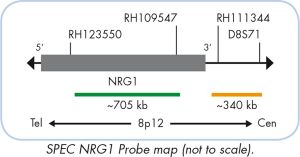 The ZytoLight ® SPEC NRG1 Dual Color Break Apart Probe is designed to detect translocations involving the chromosomal region 8p12 harboring the NRG1 (neuregulin 1, a.k.a. HGL or GGF) gene. NRG1 encodes a variety of growth factors that are ligands for tyrosine kinase receptors of the ERBB family. Rearrangements of the NRG1 gene have been detected in various tumors, including breast cancer, lung cancer, and ovarian adenocarcinoma. NRG1 translocation-positive breast tumors show a more advanced pathological stage compared with translocationnegative tumors. NRG1 rearrangements in lung adenocarcinomas of never smokers were found to result in the fusion of CD74 to the EGF-like domain of NRG1. Several in vitro studies indicate that NRG1 fusion proteins lead to an increased activation of ERBB receptors and are hence involved in tumor development. Due to the involvement of NRG1 isoforms in oncogenesis and their association with ERBB receptors, NRG1 constitutes a good candidate for potential therapeutic applications, e.g., in relation to lung tumor subtypes with so far no effective treatment. Hence, detection of NRG1 rearrangements by Fluorescence in situ Hybridization represents a useful tool for studying carcinogenesis of various solid tumors and may be of prognostic and therapeutic significance.
