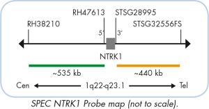 The ZytoLight ® SPEC NTRK1 Dual Color Break Apart Probe is designed to detect translocations involving the chromosomal region 1q23.1 harboring the NTRK1 (neurotrophic tyrosine kinase receptor type 1, a.k.a. TRKA or TRK) gene. NTRK1 encodes a tyrosine kinase (TK) receptor for the nerve growth factor (NGF). The NTRK1 gene was found to be rearranged in about 12% of papillary thyroid carcinoma (PTC) cases. PTC accounts for about 80% of all thyroid cancers.