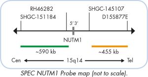 The ZytoLight ® SPEC NUTM1 Dual Color Break Apart Probe is designed to detect translocations involving the chromosomal region 15q14 harboring the NUTM1 (NUT midline carcinoma family member 1, a.k.a. NUT) gene.