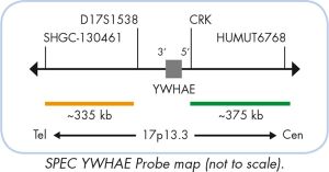 The ZytoLight ® SPEC YWHAE Dual Color Break Apart Probe is designed to detect rearrangements involving the chromosomal region 17p13.3 harboring the YWHAE (tyrosine 3-monooxygenase/ tryptophan 5-monooxygenase activation protein, epsilon a.k.a. 14-3-3 epsilon) gene.