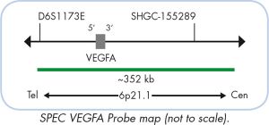 The ZytoLight ® SPEC VEGFA/CEN 6 Dual Color Probe is designed for the detection of amplifications involving the chromosomal region 6p21.1 harboring the VEGFA gene (vascular endothelial growth factor A, a.k.a. VEGF, VPF). The VEGFA protein is involved in vascular permeability, angiogenesis, cell migration, and inhibition of apoptosis. In addition, binding of VEGFA to its receptors activates the RAS/MEK/MAPK pathway, thus, leading to mitotic activation.