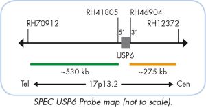 The ZytoLight SPEC USP6 Dual Color Break Apart Probe is designed to detect translocations involving the USP6 gene. Translocations affecting USP6 have been initially found in primary aneurysmal bone cysts (ABC), a benign, but locally aggressive bone lesion. More recently, nodular fasciitis (NF), another mesenchymal lesion, has been tested positive for USP6 rearrangements. For both lesions it is assumed that the detection of USP6 rearrangements by FISH represents a valuable diagnostic tool.